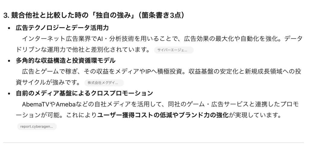 3. 競合他社と比較した時の「独自の強み」(箇条書き3点)
