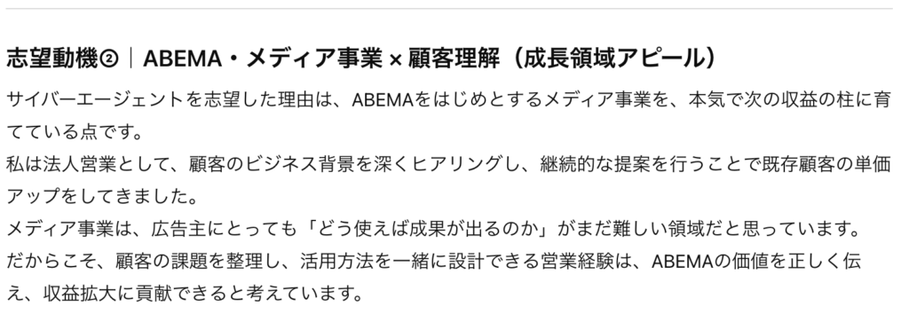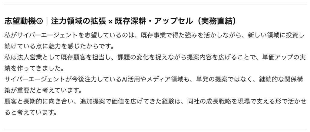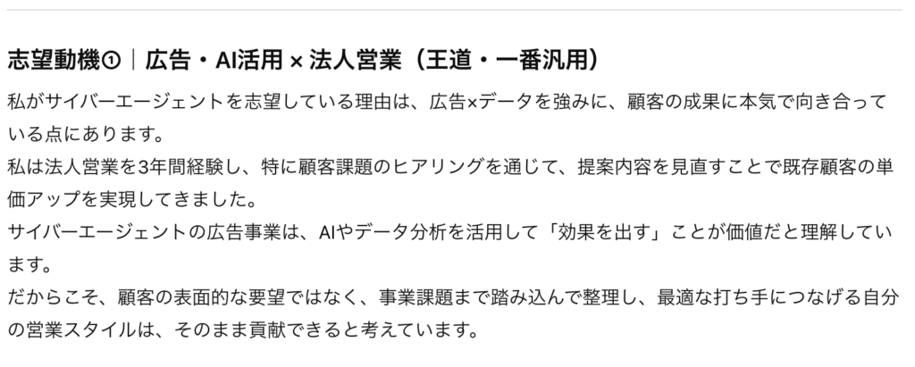 上記で分析した〇〇社の「強み」や「注力領域」に対して、 私の以下の経験がどう活かせるか、論理的な「志望動機」を3パターン作成してください。