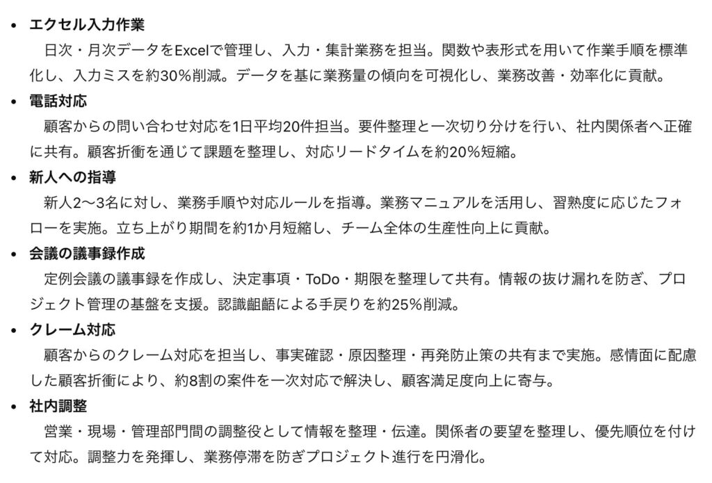 3. 以下のキーワードを積極的に使う: – 業務改善、効率化、自動化 – プロジェクト管理、調整力 – 顧客折衝、課題解決 – データ分析、仮説検証