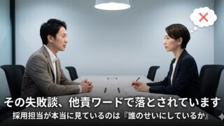 「会社の評価制度が」「上司の判断が遅くて」——その言葉、採用担当は言い訳として処理しています。失敗談で他責と判定されない語り方と、3つの自己チェックフィルターを採用側の本音から解説。